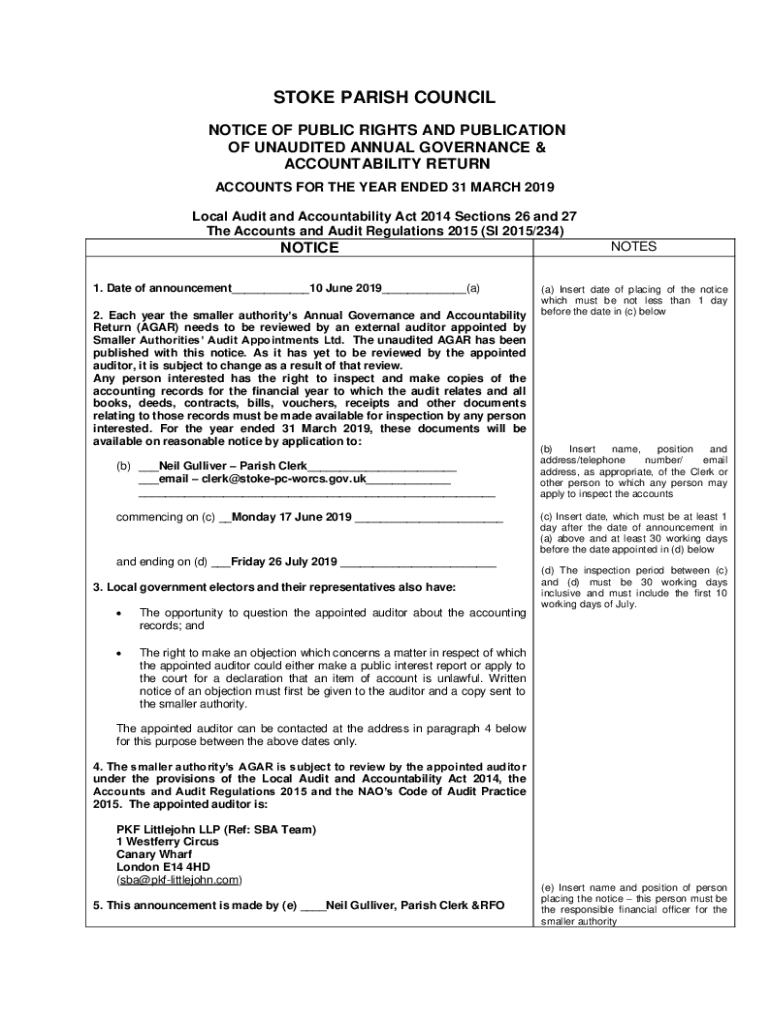 STOKE PARISH COUNCIL NOTICE OF PUBLIC RIGHTS AND PUBLICATION OF UNAUDITED ANNUAL GOVERNANCE & ACCOUNTABILITY RETURN ACCOUNTS FOR THE YEAR ENDED 31 MARCH 2019 Local Audit and Accountability Act 2014