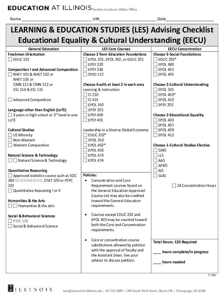 Get the free Name UIN Date LEARNING & EDUCATION STUDIES (LES) Advising ... - education il...