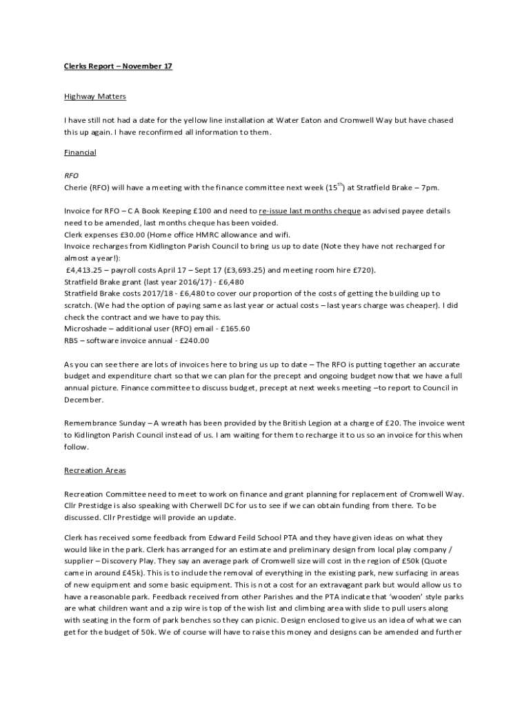 Clerks Report November 17Highway Matters I have still not had a date for the yellow line installation at Water Eaton and Cromwell Way but have chased this up again. I have reconfirmed all information