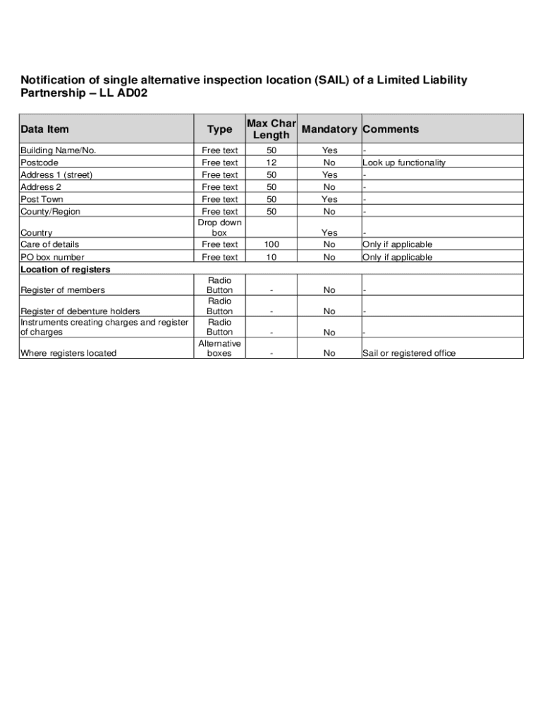 Notification of single alternative inspection location (SAIL) of a Limited Liability Partnership LL AD02 Data Item Building Name×No. Postcode Address 1 (street) Address 2 Post Town County×Region