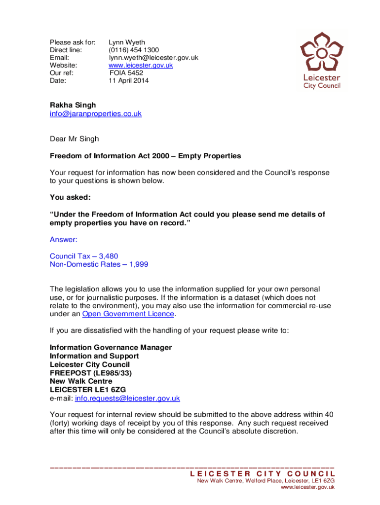 Please ask for: Direct line: Email: Website: Our ref: Date:Lynn Wyeth (0116× 454 1300 Lynn. Wyeth×Leicester.gov.UK www.leicester.gov.uk FOIA 5452 11 April 2014Rakha Singh info×jaranproperties.co.under