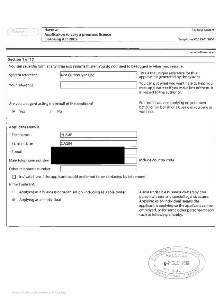 @::, LDH arrow Application to vary a premises license Licensing Act 2003For help contact !census harrow.gov UK Telephone: 020 8901 2600required informationSection 1 of 17 You can save the form at
