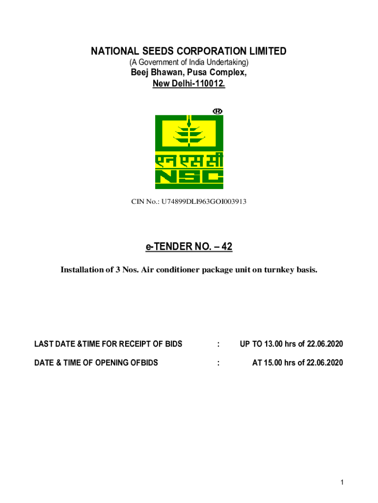 NATIONAL SEEDS CORPORATION LIMITED (A Government of India Undertaking×Been Shawn, Pusey Complex, New Delhi110012.IN No.: U74899DLI963GOI003913eTENDER NO. 42 Installation of 3 Nos. Air conditioner