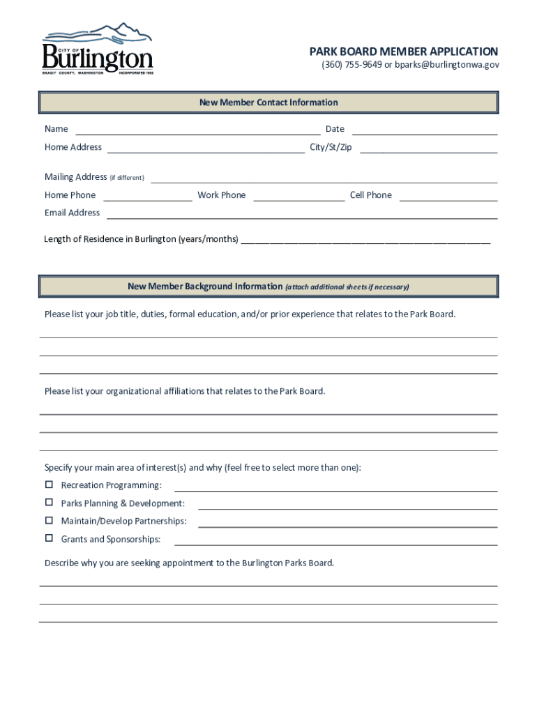 PARK BOARD MEMBER APPLICATION (360× 7559649 orb parks×Burlington.gone Member Contact Information NameDateHome Addressing×St/Airmailing Address (if different) Home Homework Photocell Phonemic Address