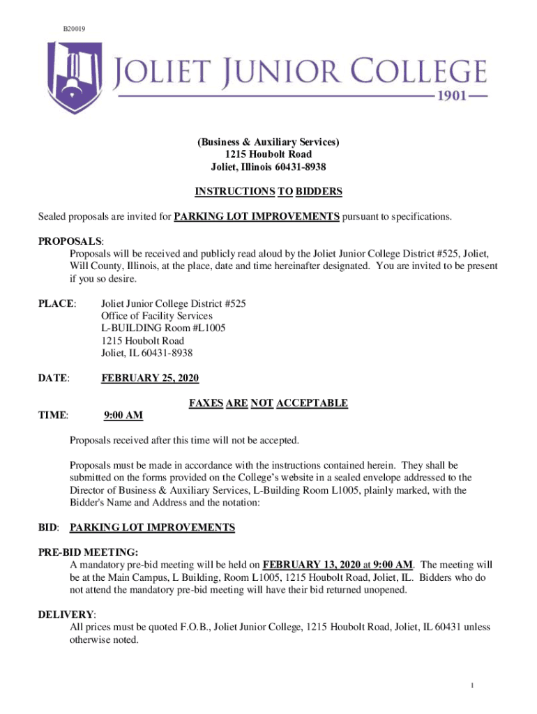 B20019×Business & Auxiliary Services) 1215 Double Road Joliet, Illinois 604318938 INSTRUCTIONS TO BIDDERS Sealed proposals are invited for PARKING LOT IMPROVEMENTS pursuant to specifications. PROPOSALS: