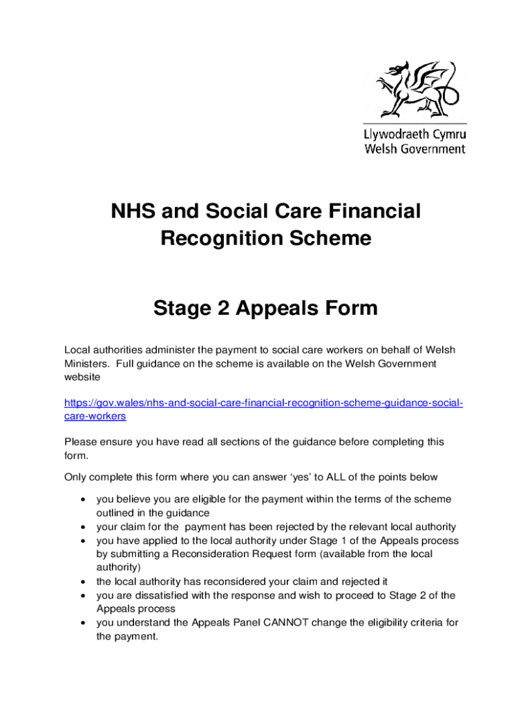 NHS and Social Care Financial Recognition SchemeStage 2 Appeals Form Local authorities administer the payment to social care workers on behalf of Welsh Ministers. Full guidance on the scheme is available