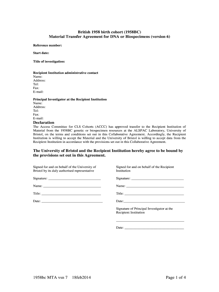British 1958 birth cohort (1958BC) Material Transfer Agreement for DNA or Biospecimens (version 6) Reference number: Start date: Title of investigation: Recipient Institution administrative contact