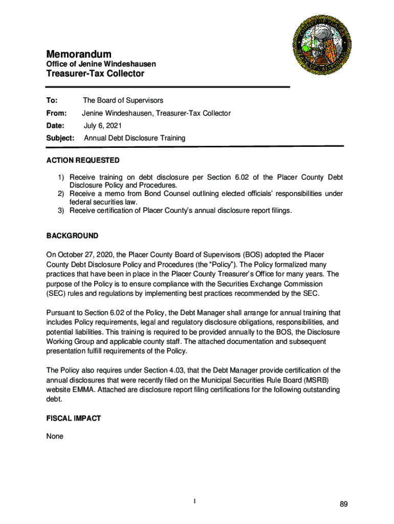 Memorandum Office of Janine WindeshausenTreasurerTax Collector To:The Board of SupervisorsFrom:Janine Windeshausen, Treasurer CollectorDate:July 6, 2021Subject:Annual Debt Disclosure TrainingACTION