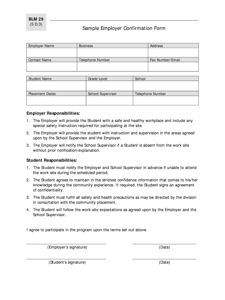 BLM 29 (5. D.3) Sample Employer Confirmation Form Employer Name Business Address Contact Name Telephone Number Fax Number/Email Student Name Grade Level School Placement Dates School Supervisor Telephone