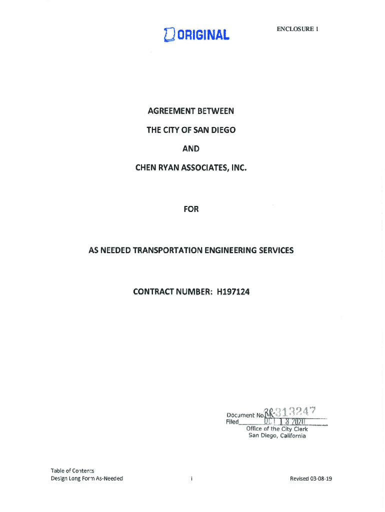 []ORIGINALENCLOSURE 1AGREEMENT BETWEEN THE CITY OF SAN DIEGO AND CHEN RYAN ASSOCIATES, INC.FORMS NEEDED TRANSPORTATION ENGINEERING SERVICESCONTRACT NUMBER: H197124NoeR31 4 /Document Filed I Office