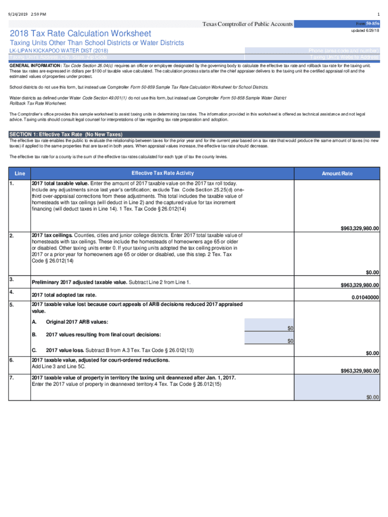 9×24/2019 2:59 PM1 Form 50856Texas Comptroller of Public Accounts updated 6×29/182018 Tax Rate Calculation Worksheet Taxing Units Other Than School Districts or Water Districts LILIAN KICKAPOO WATER