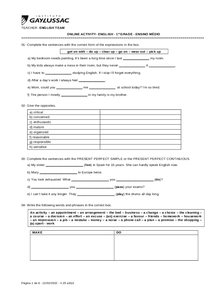 The English Activity Worksheet is specifically crafted to enhance the English skills of 1st grade high school students in Brazil. Its primary purpose is to provide engaging exercises that improve students' command over English grammar and vocabulary. Included in the worksheet are various types of exercises such as sentence completion, opposites, and general grammar practice, tailored to meet the educational needs of high school learners.
