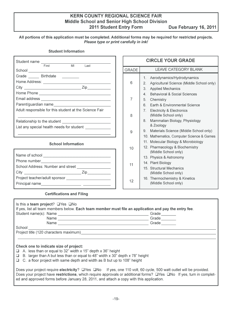 KERN COUNTY REGIONAL SCIENCE FAIR Middle School and Senior High School Division 2011 Student Entry Form Due February 16, 2011, All portions of this application must be completed. Additional forms