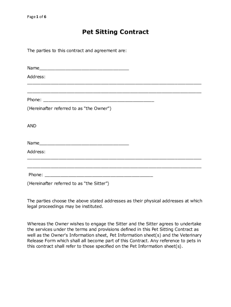 Page 1 of 6Pet Sitting Contract The parties to this contract and agreement are:Name___ Address: ___ ___ Phone: ___ (Hereinafter referred to as \” the Owner\”)Endgame___ Address: ___ ___ Phone: