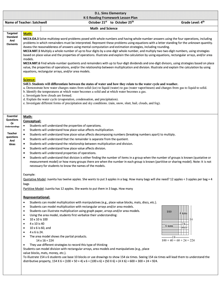 Name of Teacher: Satchell D.L. Sims Elementary K5 Reading Framework Lesson Plan October 21st to October 25th Grade Level: 4th Math and Science Targeted Standard And Elements Math: MCC4.OA.3 Solve