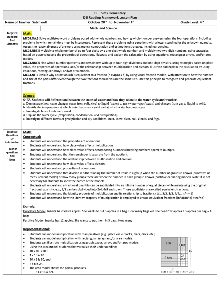 Name of Teacher: Satchell D.L. Sims Elementary K5 Reading Framework Lesson Plan October 28th to November 1st Grade Level: 4th Math and Science Targeted Standard And Elements Math: MCC4.OA.3 Solve