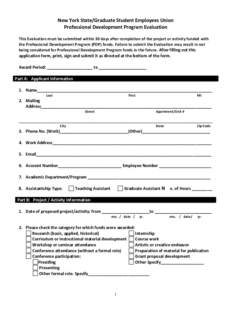 New York State×Graduate Student Employees Nonprofessional Development Program Evaluations Evaluation must be submitted within 30 days after completion of the project or activity funded with the Professional