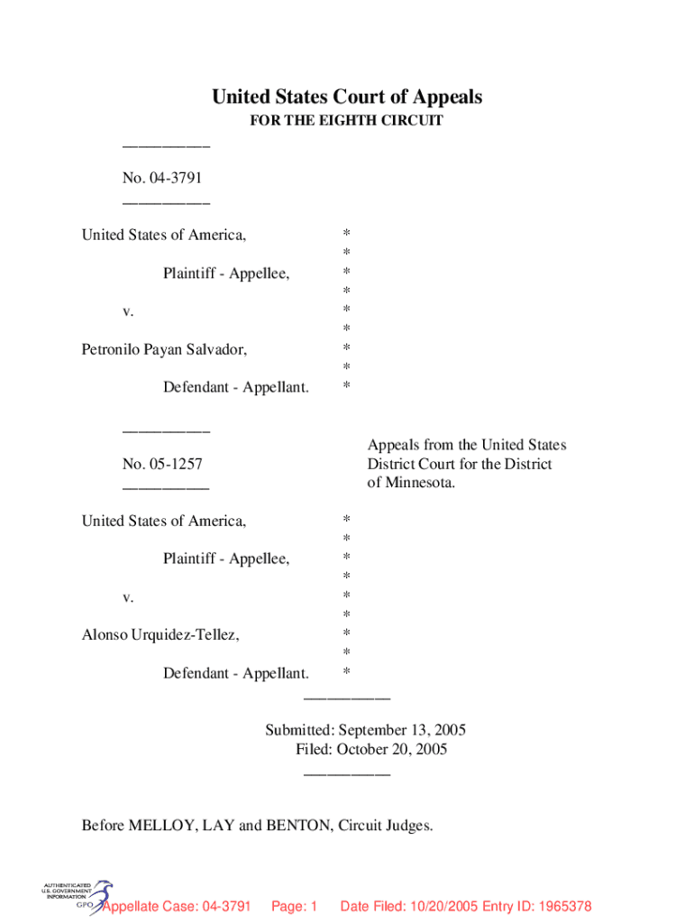 United States Court of Appeals FOR THE EIGHTH CIRCUIT___ No. 043791 ___ United States of America, Plaintiff Appealed, v. Geronimo Pagan Salvador, Defendant Appellant.* * * * * * * * *___ Appeals from