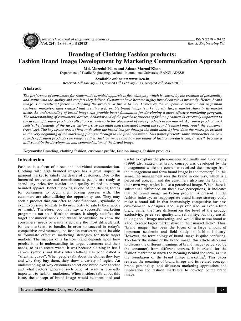 Research Journal of Engineering Sciences ISSN 2278 9472 Vol. 2(4), 2833, April (2013) Res. J. Engineering Sci. Branding of Clothing Fashion products: Fashion Brand Image Development by Marketing Communication