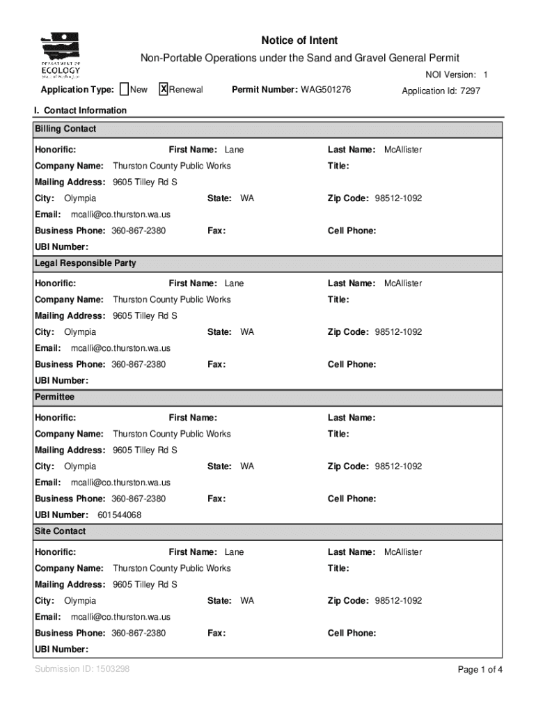 Notice of Intent Unportable Operations under the Sand and Gravel General Permit NOI Version: 1 Application Type:New RenewalPermit Number: WAG501276Application I'd: 7297I. Contact Information Billing