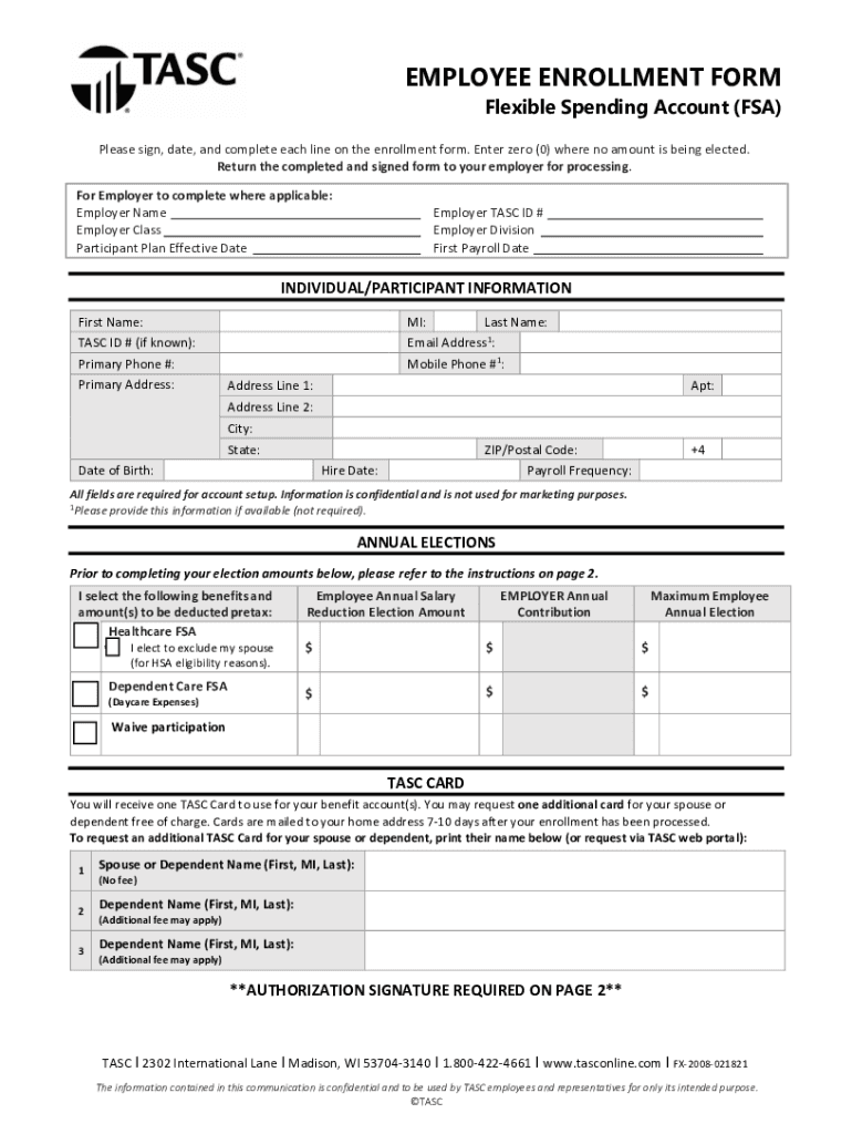 EMPLOYEE ENROLLMENT FORM Flexible Spending Account (FSA) Please sign, date, and complete each line on the enrollment form. Enter zero (0) where no amount is being elected. Return the completed and