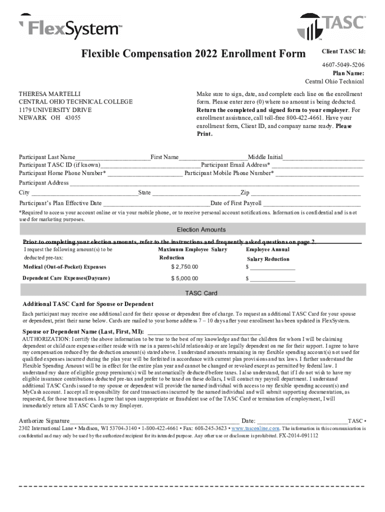 Flexible Compensation 2022 Enrollment Formulaic TASK I'd:460750495206 Plan Name: Central Ohio TechnicalTHERESA MARTEL CENTRAL OHIO TECHNICAL COLLEGE 1179 UNIVERSITY DRIVE NEWARK OH 43055Make sure
