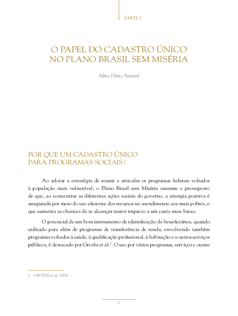 PARTE IO PAPEL DO CADASTRO NICO NO PLANO BRASIL SEM MISRIA Aline Diniz AmaralPOR QUE UM CADASTRO NICO PARA PROGRAMAS SOCIAIS? Ao adotar a estratgia de reunir e articular os programas federais voltados