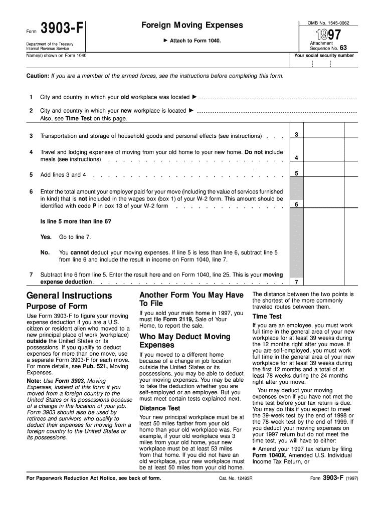 Use Form 3903-F to figure your moving expense deduction if you are a U.S. citizen or resident alien who moved to a new principal place of work outside the United States or its possessions.