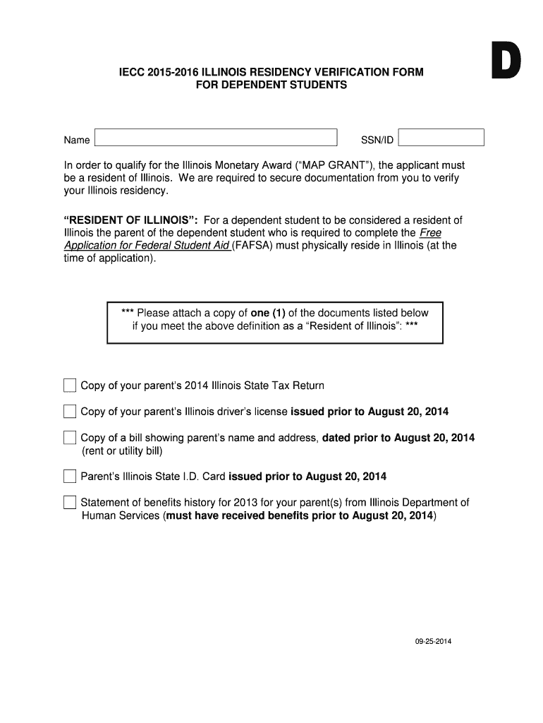 IEC 2015-2016 ILLINOIS RESIDENCY VERIFICATION FORM FOR DEPENDENT STUDENTS Name SSN/ID In order to qualify for the Illinois Monetary Award (MAP GRANT), the applicant must be a resident of Illinois.