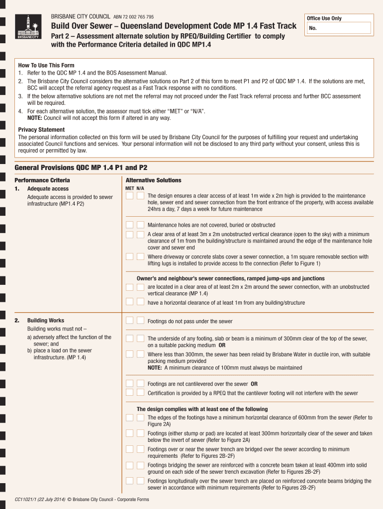 BRISBANE CITY COUNCIL ABN 72 002 765 795 Instructions Build Over Sewer Queensland Development Code MP 1.4 Fast Track Office Use Only No. Part 2 Assessment alternate solution by RPE/Building Certifier