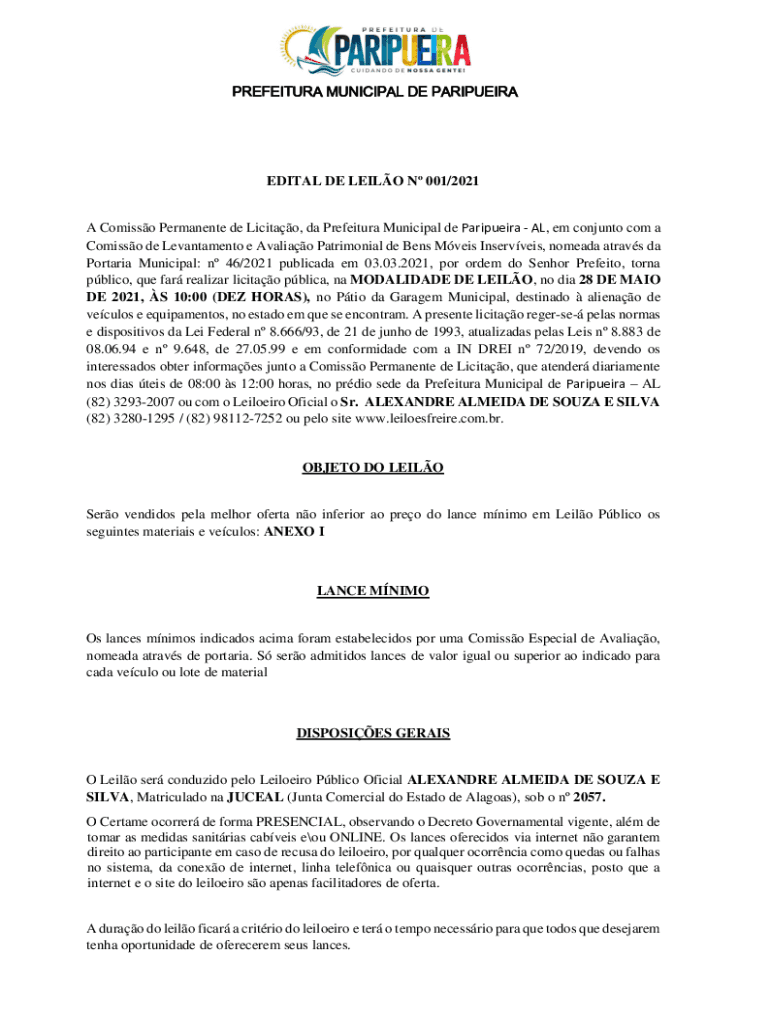 PREFECTURE MUNICIPAL DE PARIPUEIRAEDITAL DE LEILA N 001×2021A Comics Permanent de Licitao, the Prefecture Municipal de Paripueira AL, em conj unto com a Comics de Levantamento e Amalia Patrimonial