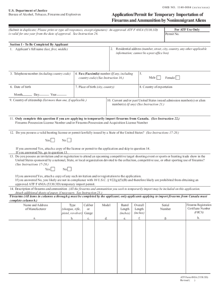 OMB NO. 11400084 (xx×xx/XXX×U.S. Department of Justice Bureau of Alcohol, Tobacco, Firearms and ExplosivesApplication×Permit for Temporary Importation of Firearms and Ammunition by Nonimmigrant