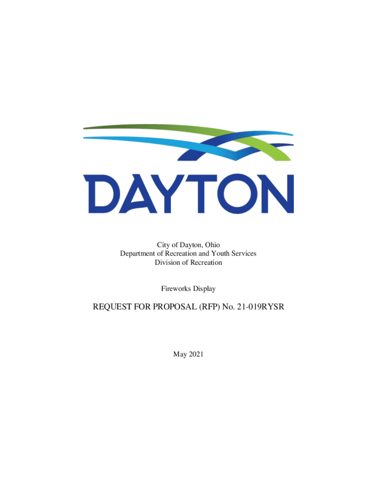 City of Dayton, Ohio Department of Recreation and Youth Services Division of RecreationFireworks DisplayREQUEST FOR PROPOSAL (RFP) No. 21019RYSRMay 2021TABLE OF CONTENTS SECTION 1 PROPOSAL INSTRUCTIONS