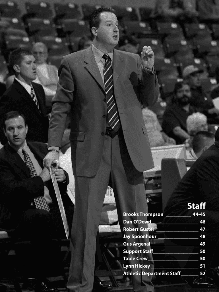 Staff Brooks Thompson_ ___ 4445 Dan Down_ ___ 46 Robert Muster___ 47 Jay Spoon hour_ ___ 48 Gus Arsenal___ 49 Support Staff___ 50 Table Crew___ 50 Lynn Hickey___ 51 Athletic Department Staff___ 52Brooks