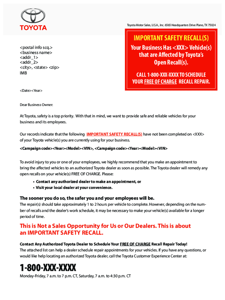 Toyota Motor Sales, U.S.A., Inc. 6565 Headquarters Drive Plano, TX 75024IMPORTANT SAFETY RECALL’S) postal info sci. Business name add×1 add×2 city, state zip Your Business Has XXX Vehicle’s)