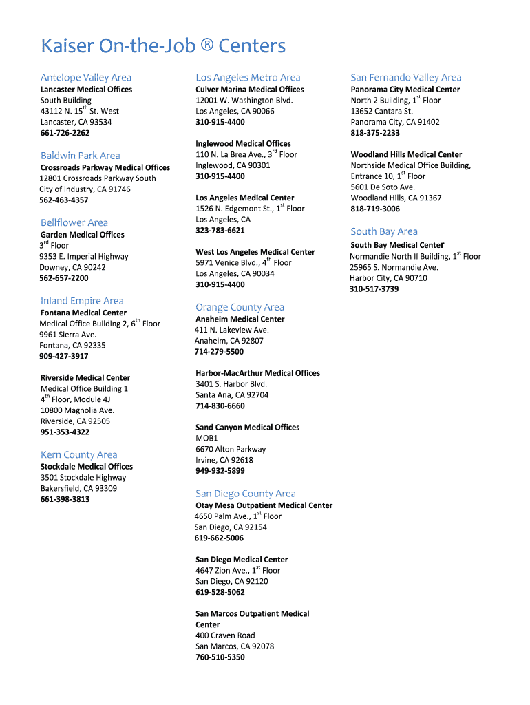 Kaiser OntheJob Centers Antelope Valley Area Los Angeles Metro Area San Fernando Valley Area Lancaster Medical Offices South Building TH 43112 N. 15 St. West Lancaster, CA 93534 6617262262Culver Marina