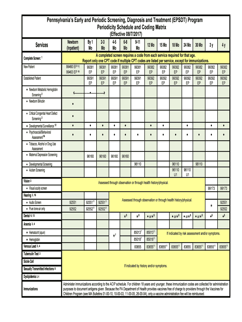 Pennsylvania's Early and Periodic Screening, Diagnosis and Treatment (EPS DT) Program Periodicity Schedule and Coding Matrix (Effective 08/7/2017)ServicesNewborn (Inpatient)Complete Screen: 1 99460