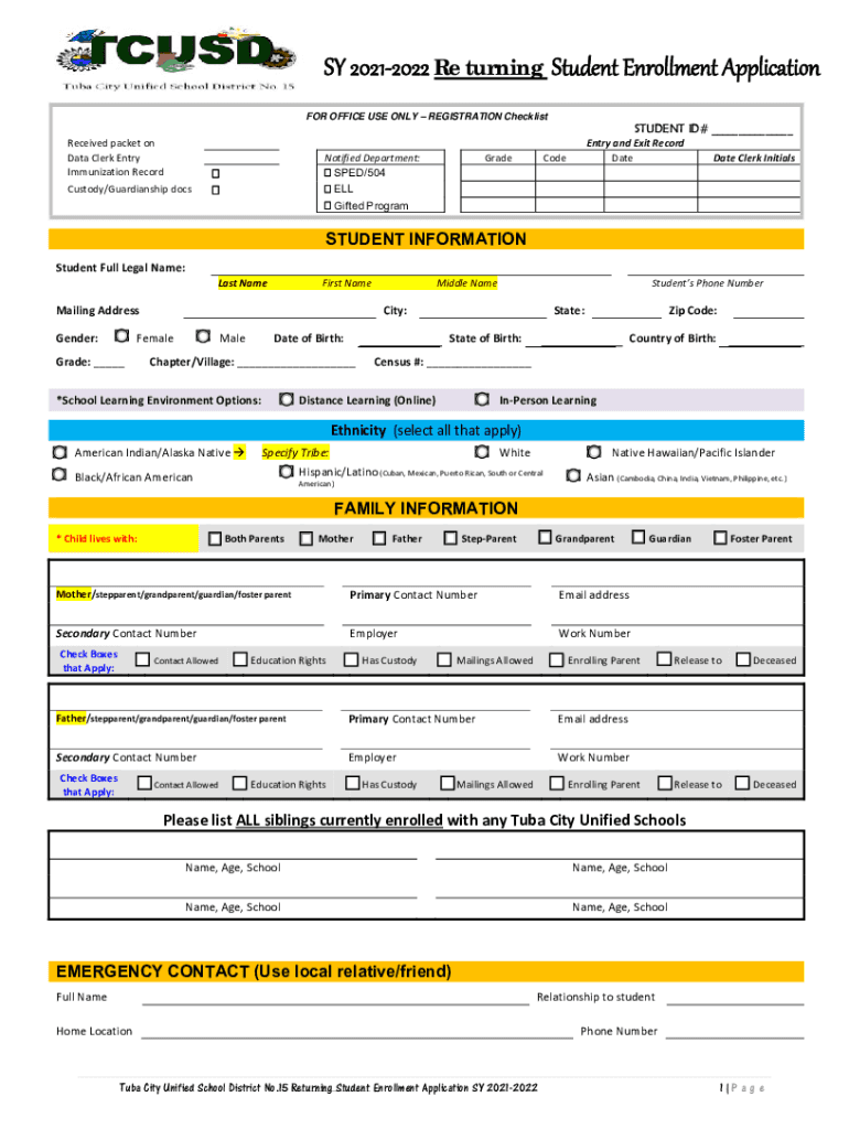 SY20212022ReturningStudentEnrollmentApplicationFOR OFFICE USE ONLY REGISTRATION ChecklistSTUDENT ID# ___ Receivedpacketon DataClerkEntry ImmunizationRecord Custody×Guardianship docs Notified Department: