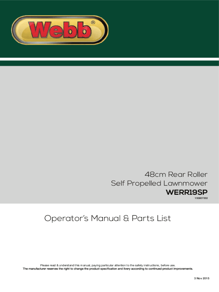 48 cm Rear Roller Self Propelled Lawnmower WERR19SP 193807002Operators Manual & Parts Displease read & understand this manual, paying particular attention to the safety instructions, before use.3