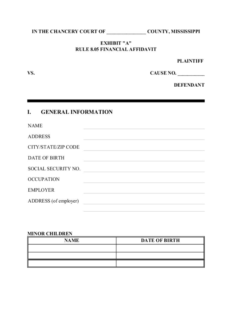 IN THE CHANCERY COURT OF ___ COUNTY, MISSISSIPPI EXHIBIT \” A\” RULE 8.05 FINANCIAL AFFIDAVIT PLAINTIFF VS.CAUSE NO. ___ DEFENDANT.GENERAL INFORMATIONAL ADDRESS CITY×STATE×ZIP CODE DATE OF BIRTH
