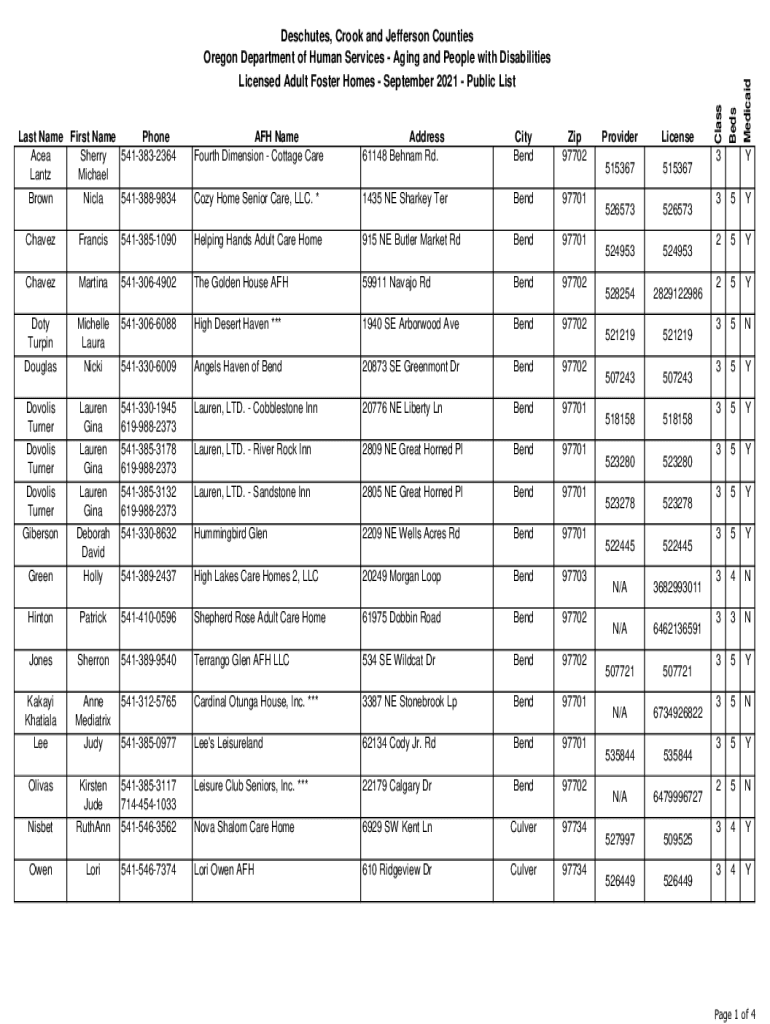 Address 61148 Beam Rd. City Bendix 97702BrownNicla5413889834Cozy Home Senior Care, LLC. *1435 NE Sharia TerBend97701ChavezFrancis5413851090Helping Hands Adult Care Home915 NE Butler Market RdBend97701ChavezMartina5413064902The
