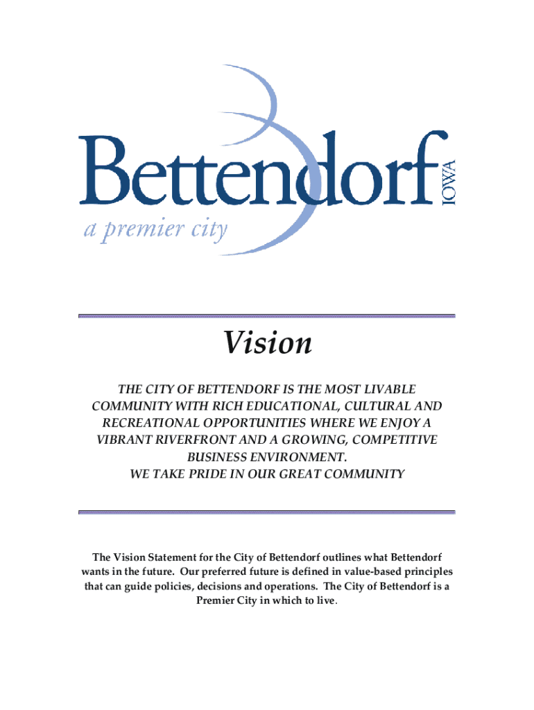 Vision THECITYOFBETTENDORFISTHEMOSTLIVABLE COMMUNITYWITHRICHEDUCATIONAL, CULTURAL AND RECREATIONALOPPORTUNITIESWHEREWEENJOYA VIBRANTRIVERFRONTANDAGROWING, COMPETITIVE BUSINESSENVIRONMENT. WETAKEPRIDEINOURGREATCOMMUNITY