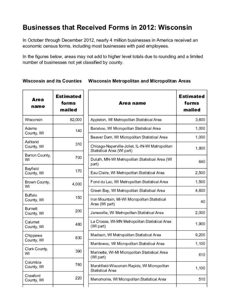Businesses that Received Forms in 2012: Wisconsin In October through December 2012, nearly 4 million businesses in America received an economic census forms, including most businesses with paid employees.