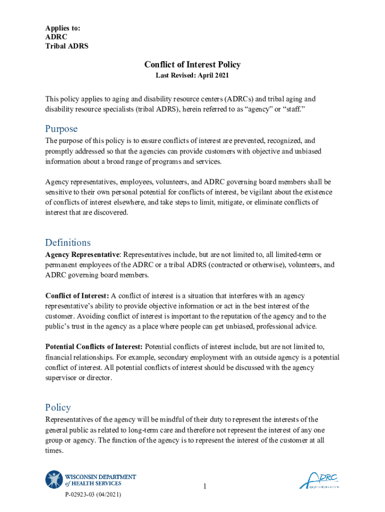 Applies to: ARC Tribal ADRSConflict of Interest Policy Last Revised: April 2021This policy applies to aging and disability resource centers (Arcs) and tribal aging and disability resource specialists