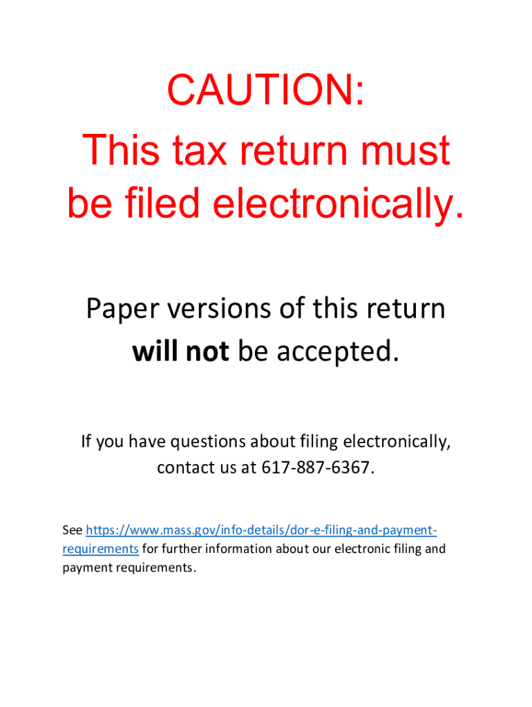 CAUTION: This tax return must be filed electronically. Paper versions of this return will not be accepted. If you have questions about filing electronically, contact us at 6178876367. See HTTPS://www.mass.gov×info