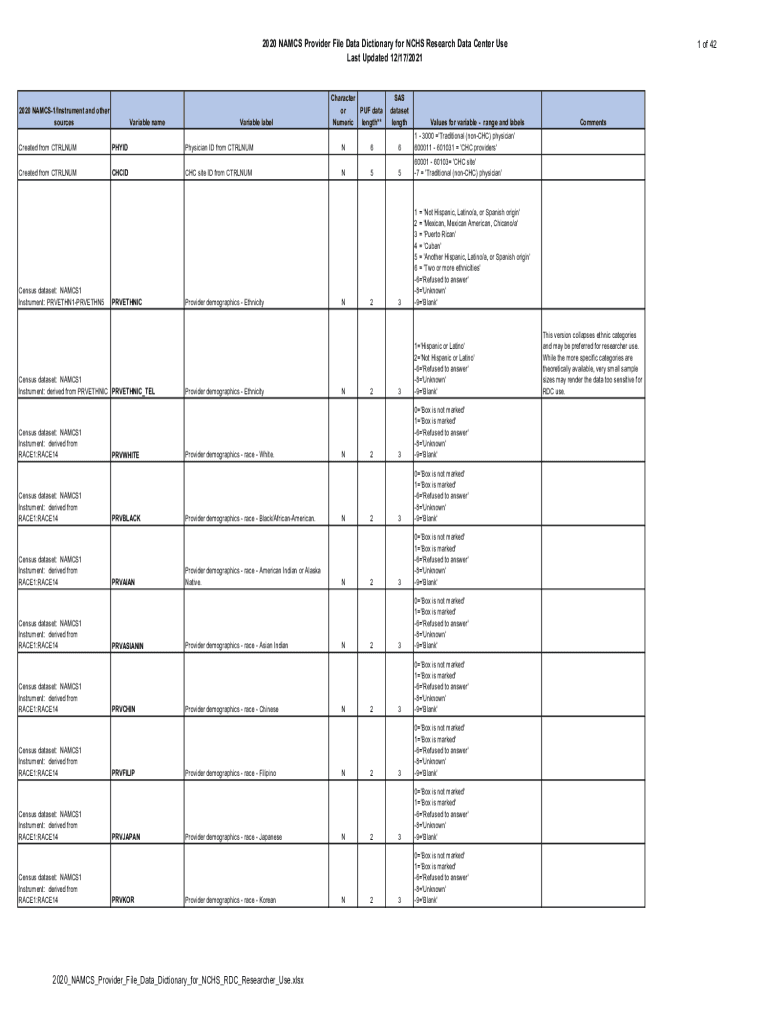 2020 NAMES Provider File Data Dictionary for NHS Research Data Center Uses Last Updated 12×17/20212020 NAMCS1×Instrument and other sourcesVariable gram-variable labelCharacter or PUF data length**