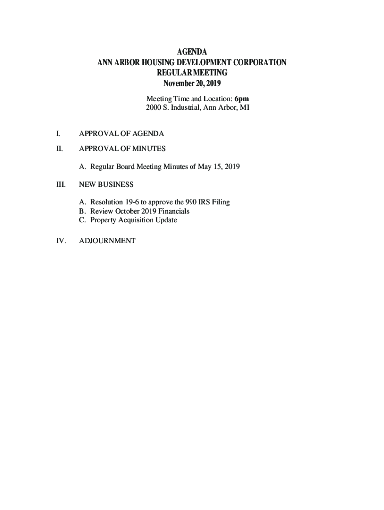 AGENDA ANN ARBOR HOUSING DEVELOPMENT CORPORATION REGULAR MEETING November 20, 2019, Meeting Time and Location: 6pm 2000 S. Industrial, Ann Arbor, MID.APPROVAL OF AGENDA.APPROVAL OF MINUTES A. Regular