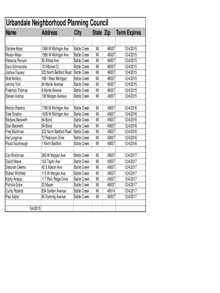 Urbandale Neighborhood Planning Council NameAddressCityDarlene Mayo Mason Mayo Rebecca Runyon Sara Schalke Joshua Fauna Walt McIlroy Johnny Pick Freeman Thomas Steven Andrus1586 W Michigan Ave 1586