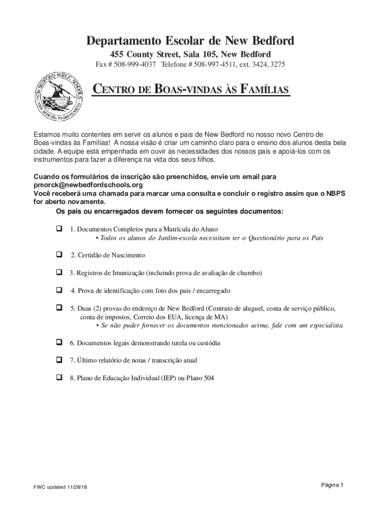 Department Escolar de New Bedford 455 County Street, Sale 105, New Bedford Fax # 5089994037 Telephone # 5089974511, ext. 3424, 3275CENTRO DE BOASVINDAS S FAMILIES Estates moot contents' em server