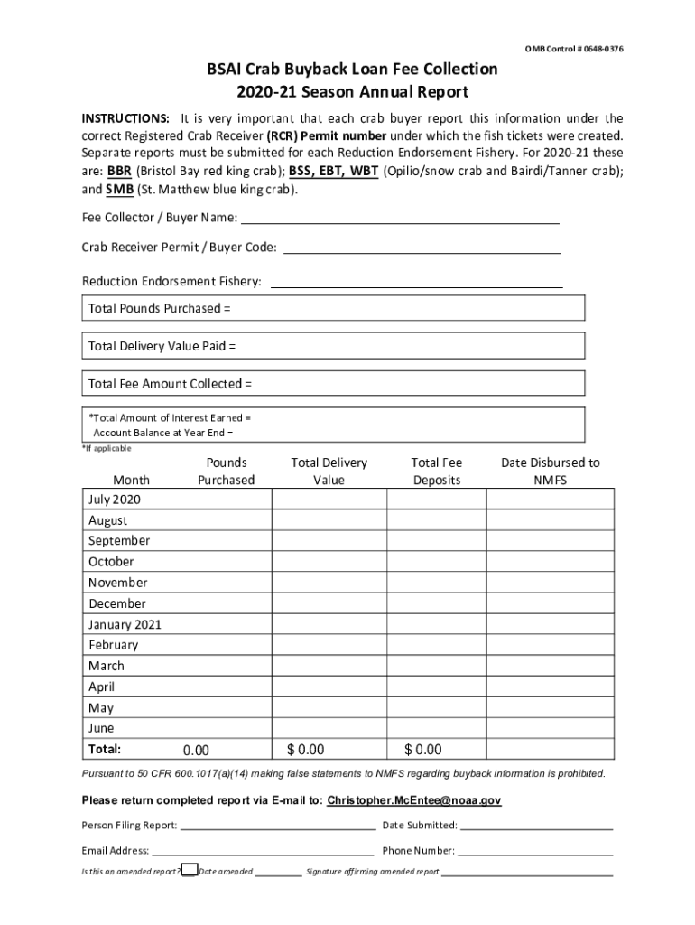 OMB Control # 06480376BSAI Crab Buyback Loan Fee Collection 202021 Season Annual Report INSTRUCTIONS: It is very important that each crab buyer report this information under the correct Registered